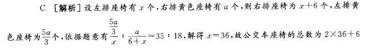 问题 某公交车左右侧都有座椅,其中两侧两排黄色座椅的数量占各自一侧座椅数量比重之比为35:18,左侧黄色座椅比右侧黄色座椅多2/3,右排座椅比左排座椅多6个,则该公交车共有座椅()个。 A.54 B.63 C.78 D.81