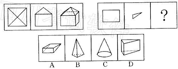 解析 观察第一组图可以发现,其中的第一个图形是第三个图形的俯视图,第二个图形是第三个图形的正视图或侧视图。由此规律,结合第二组图形中的第一个图形和第二个图形,可知答案为A选项。
