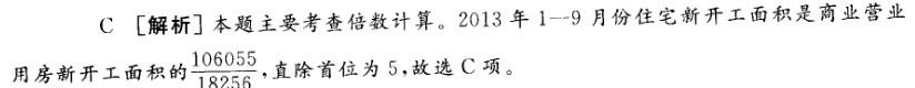 问题 2013年1—9月份,全国房地产开发投资61120亿元,同比增长19.7%增速比1—8月份提高0.4个百分点。其中,住宅投资41979亿元,增长19.5%,增速提高0.3个百分点,占房地产开发投资的比重为68.7%。 1—9月份,东部地区房地产开发投资34413亿元,同比增长18.0%,增速比1—8月份提高0.6个百分点;中部地区投资13127亿元,增长20.0%,增速提高0.6个百分点;西部地区投资13580亿元,增长24.3%,增速与1—8月份持平。 1—9月份,房地产开发企业房屋施工面积603982万平方米,同比增长15.0%,增速比1—8月份提高0.6个百分点;其中,住宅施工面积443102万平方米,增长12.5%。房屋新开工面积144900万平方米,增长7.3%,增速提高3.3个百分点;其中,住宅新开工面积106055万平方米,增长6.4%。房屋竣工面积52706万平方米,增长4.2%,增速回落0.4个百分点;其中,住宅竣工面积41170万平方米,增长1.4%。 1—9月份,房地产开发企业土地购置面积25167万平方米,同比下降3.3%,降幅比1—8月份收窄5.8个百分点;土地成交价款6082亿元,增长14.6%,增速提高9.4个百分点。 2013年1—9月份住宅新开工面积约是商业营业用房新开工面积的()。 A.7.94倍 B.3.96倍 C.5.81倍 D.23.02倍