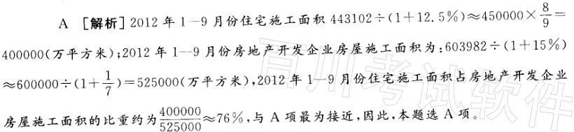 问题 2013年1—9月份,全国房地产开发投资61120亿元,同比增长19.7%增速比1—8月份提高0.4个百分点。其中,住宅投资41979亿元,增长19.5%,增速提高0.3个百分点,占房地产开发投资的比重为68.7%。 1—9月份,东部地区房地产开发投资34413亿元,同比增长18.0%,增速比1—8月份提高0.6个百分点;中部地区投资13127亿元,增长20.0%,增速提高0.6个百分点;西部地区投资13580亿元,增长24.3%,增速与1—8月份持平。 1—9月份,房地产开发企业房屋施工面积603982万平方米,同比增长15.0%,增速比1—8月份提高0.6个百分点;其中,住宅施工面积443102万平方米,增长12.5%。房屋新开工面积144900万平方米,增长7.3%,增速提高3.3个百分点;其中,住宅新开工面积106055万平方米,增长6.4%。房屋竣工面积52706万平方米,增长4.2%,增速回落0.4个百分点;其中,住宅竣工面积41170万平方米,增长1.4%。 1—9月份,房地产开发企业土地购置面积25167万平方米,同比下降3.3%,降幅比1—8月份收窄5.8个百分点;土地成交价款6082亿元,增长14.6%,增速提高9.4个百分点。 2012年1—9月份住宅施工面积占房地产开发企业房屋施工面积的()。 A.75% B.78% C.81% D.72%