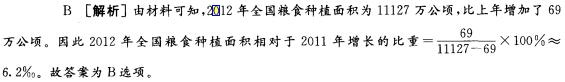 问题 我国2012年全年粮食种植面积11127万公顷,比上年增加69万公顷;棉花种植面积470万公顷,减少34万公顷;油料种植面积1398万公顷,增加12万公顷;糖料种植面积203万公顷,增加9万公顷。 2012年全年粮食产量58957万吨。其中,夏粮产量12995万吨,增产2. 8%;早稻产量 3329万吨,增产1.6%;秋粮产量42633万吨,增产3. 5%。其中,主要粮食品种中,稻谷产量 20429万吨,增产1. 6%;小麦产量12058万吨,增产2. 7%;玉米产量20812万吨,增产8.0%。 全年棉花产量684万吨,比上年增产3.8%。油料产量3476万吨,增产5.1%。糖料产量 13493万吨,增产7.8%。烤烟产量320万吨,增产11. 5%。茶叶产量180万吨,增产11. 2%。 我国2012年全国粮食种植面积相对于2011年增长了( )。 A. 5.8% B. 6.2% C. 6.7%。 D.7.2%