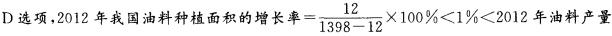 解析 A选项,根据第116题的结果,2012年我国粮食种植面积的增长率= 6.2%0<2012年粮食产量的增长率3.2%,故2012年的粮食亩均产量大于2011年,错误。B选项,直接读数可知,2012年的玉米产量为20812万吨,小于粮食产量的一半58957÷2 = 29478. 5(万吨),错误。C选项,按照2012年的增长速度,2013年我国的粮食产量=58957 ×(1 + 3. 2%)= 60000+(万吨),正确,当选。 的增长率5. 1%,故2012年油料的亩均产量是增加的,错误。