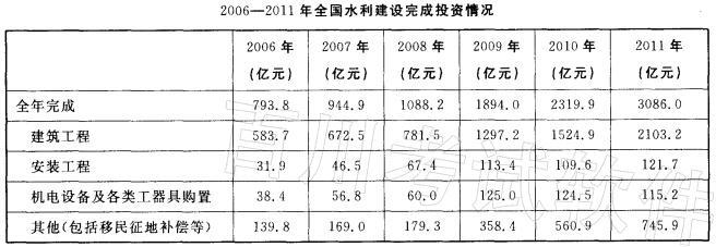 解析 根据表中第四行可知,2008年、2009年、2010年、2011年安装工程每年完成投资额增量分别为(67. 4-46. 5)亿元、(113. 4-67. 4)亿元、(109. 6-113. 4)亿元、(121. 7-109. 6)亿元。简单比较可知第二项最大,故选B项。