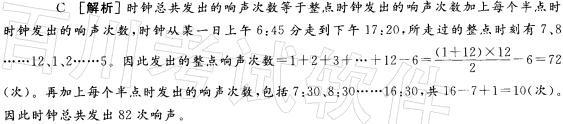 问题 小明家有一架时钟,每个半点(即1点半、2点半、3点半……)时,时钟就会发出一声响声, 每当到整点时,时钟就会发出当前时针所指的数字次的响声。那么从某一日的上午6:45 到该日下午17:20,这个时钟共发出多少次响声?( ) A. 72 B. 78 C. 82 D. 142