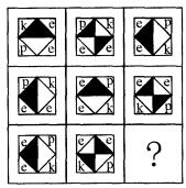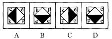 解析 九宫格中的每个图形,都是由中间的菱形和外围的四个带字母的小三角形组成,外面小三角形呈现的变化规律是每一行三个图形依次按照顺时针方向移动一个格子,据此规律,可以排除A、B两项。再看其他规律,菱形图案可通过连接对角线分为四个部分,分别为左上、右上、左下、右下。观察菱形中四个部分的变化规律可知,第一行中第一个、第二个、 第三个菱形左上均为黑。可得公式①黑+黑=黑,同理可得公式②黑+白=白,③白+白=黑,④白+黑=白。此四个公式在第二行中也成立。第三行应遵循同样的规律。可推知“?”处图形中的菱形的左下、右下部分应为黑,排除C项。故本题答案应选D项。