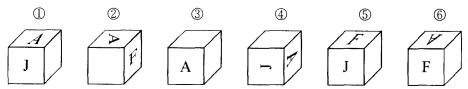 解析 本题考查立方体特殊面的关系。首先观察①和④,均有字母A、J的两个面相邻,但字母的相对位置明显不同,由此可以判断,①和④所呈现的是两个不同的正方体,排除B、C两项。观察选项,A、D两项的区别在于⑤和⑥分别对应哪种立方体,首先观察⑤,其与 ①类似,都是正面为字母J,侧面为空白,如果为同一立方体,则必然上面字母也应相同,由此可知,⑤与①不是同一个立方体。经验证可得,答案为D。