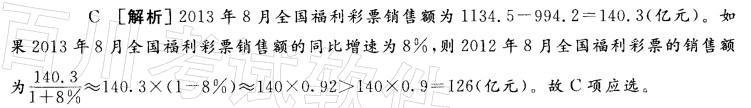 问题 如果2013年8月全国福利彩票销售额的同比增速为8%(不计其他因素),则2012年8月全国福利彩票的销售额约为( )。 A.110亿元 B.120亿元 C.130亿元 D.无法计算