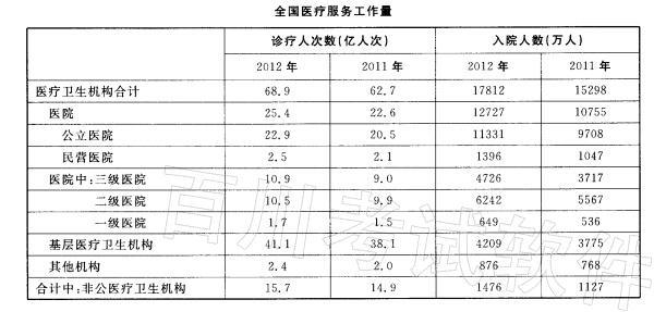 解析 根据表格中数据:2012年公立医院入院人数为11331万人,民营医院入院人数为1396万人,故公立医院入院人数是民营医院入院人数的倍数为。因此,本题答案为A。