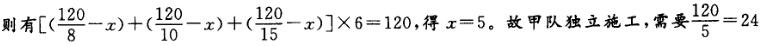 解析 8,10,15和6的最小公倍数为120,故假定这项工程的工作量为120,甲队每天的工作量为x,则有(天)完成。选C。