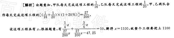 问题 一项挖土工程,如果甲队单独做16天可以完成,乙队单独做要20天才能完成。现在两队同时施工,工作效率提高了20%。当工程完成了 1/4时,突然遇到地下水,影响施工进度,使得每天少挖了47. 25立方米的土,结果共用了10天完成工程。整个工程要挖土多少立方米?( ) A. 800 B. 1100 C. 1700 D. 2000