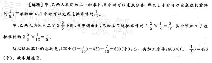 问题 甲、乙两人共同加工一批零件,8小时可以完成任务。如果甲单独加工,便需要12小时完成,现在甲、乙两人共同加工了12/5小时后,甲被调出做其他工作,由乙继续加工了420个零件才完成任务,乙一共加工零件多少个?( ) A. 360 B. 480 C. 500 D. 620