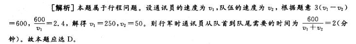 问题 一支600米长的队伍行军,队尾的通讯员要与最前面的连长联系,他用3分钟跑步追上了连长,又在队伍休息的时间以同样的速度跑回了队尾,用了2分24秒,如队伍和通讯员均匀速前进,则通讯员在行军时从最前面跑步回到队尾需要多长时间?( ) A. 48秒 B. 1分钟 C. 1分48秒 D. 2分钟