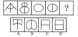 解析 前四个图形分别为字母A、B、C、D翻转后拼在一起组成的图案,因此下一项应该是字母E翻转后拼接成的图案,故答案选D。
