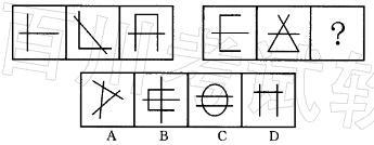解析 第一组图中吴个图形的线头数均为4个,第二组图中的前两个图形的线头数也为4 个,所以只要第三个图形的线头数也为4个,就符合规律,故本题选C。