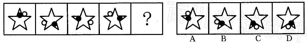 解析 本题考查的是图形元素位置的变化。观察图形可发现黑色小球和白色小球分别在五角星内和五角星外移动。黑色小球在五角星内,在两边相交而成的内角上,每次顺时针旋转两个内角。白色小球在五角星外部,在两边相交成的外角上,每次逆时针旋转两个外角。只有C项符合此规律。