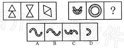 解析 图形规律是:第二个图形是第一个图形的上半部分图形上下翻转后形成的围形,第三个图形是第二个图形上面的图形的某一边与下面图形的某一边重合后形成的图形。故本题正确答案为A。注意B、C项中两个图形的结合处并不是边的完全重合,而是点重合。
