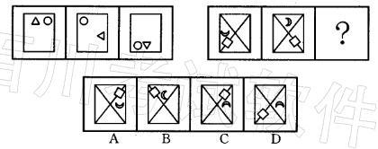 解析 第一幅图形的规律为,左边的三角形在图形内部依次顺时针旋转一个边,且自身逆时针旋转90°,右边的圆形在图形内部依次逆时针旋转一个边。第二幅图形规律类似,下边的小正方形在对角线依次逆时针旋转,排除B、D两项。上边的月牙形在对角线分割的空间中依次顺时针旋转一个位置,且自身依次逆时针旋转90°。故本题选C。