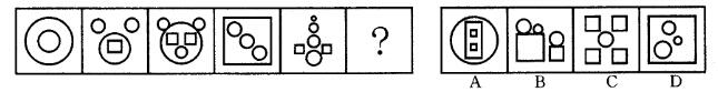 解析 本题属于数量类题目。題干中每幅图形包含的圆圈与方块数量之差依次为:2-0 = 2,3-1 = 2,4-2 = 2,3-1 = 2,4-2 = 2。选项中只有D项包含的面圈与方块的数量之差为2。故本题答案为D选项。