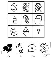 解析 每一行分别由一个纯直线图形、一个纯曲线图形和一个直曲结合的用形构成,问号处应选一个直曲结合的图形。故选D。