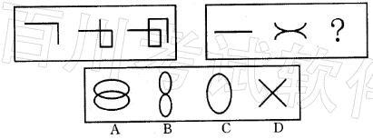 解析 第一组图形中,从第一幅到第三幅图实际上表现的是一个图形的完成过程;第二组图形中,第一幅图可以看成是两条重合的直线,第二幅图中重合的直线被拉成了两条曲线,故第三幅图中两条曲线应完成为两个椭圆。从曲线的位置和形状来看,A项最符合完成图的形态。故正确答案为A。
