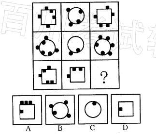解析 每行前两个图形内黑点(黑块)数目相减,图形外黑点(黑块)数目相加,构成第三幅图形。第一行图形为矩形+图=矩形,第二行图形为圆+圆=圆,故第三行应为矩形+矩形=矩形,所以答案为A。