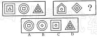 解析 第一组图形中每种元素均出现了三次,按照此规律,第二组图形中,问号处应是两个圆形和一个菱形的组合图形。故本题正确答案为B。