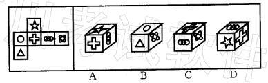 解析 A项中三个相连的圆圈必须是横排,B项右侧面的图形应该是在看不见的左侧面,C 项的顶部应该是个五角星。本题正确选项为D。