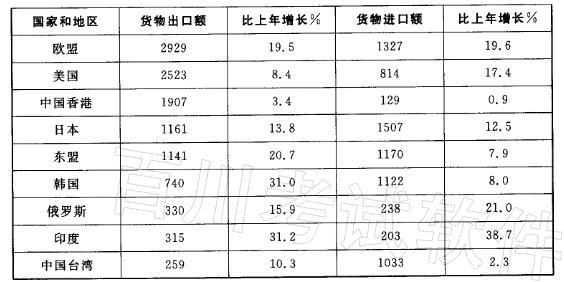 根据材料,除印度外,我国对主要国家和地区货物进出口总额增长率最高的国家(地区)的进口额为多少亿美元?( )A. 2929 B. 1327 C. 740...