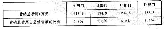 下表为某公司四个部门2009年全年的营销总费用,以及营销总费用占总销售额的比例。请问四个部门当中,哪个部门2009年全年的总销售额最高?( )A....