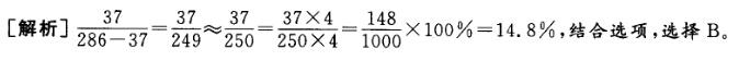 问题 2009年,某地区农产品外贸顺差额为286万美元,比上年增长了37万美元。那么请问2009年该地区农产品外贸顺差额的增幅为多少?( ) A. 11. 51% B. 14.86% C. 16.42% D. 18.79%