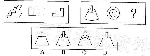 解析 本题考查的是图形中的俯视图和侧视图,第一组图形中的第二幅图是第一幅的俯视图,第三幅是第一幅的侧视图。第二组图形中,按照上述规律,得出本题答案为D。