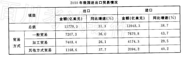 根据下列资料回答问题。2010年,我国进出口贸易总额为29727. 6亿美元,同比增长34. 7%。2010年,我国机电产品出口 9334. 3亿...