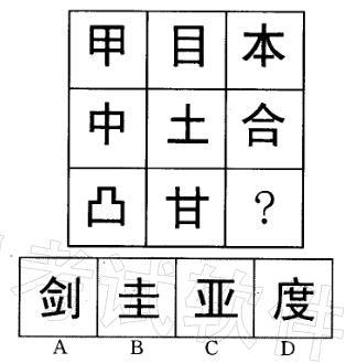 解析 前两行中,每行的汉字均为对称结构,且有两个汉字包含封闭区间,一个汉字不包含。按照此规律,第三行缺少一个不包含封闭区间的对称汉字,故本题正确答案为B。