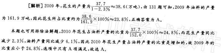 问题 2010年,江苏省全年粮食总产量达3235. 1万吨,比上年增加5万吨;其中夏粮1105. 3万吨,增长0. 2%;秋粮2129. 8万吨,增长0.1%。全年粮食面积为528. 2万公顷,比上年增加1. 0万公顷;棉花面积为23. 6万公顷,减少1. 7万公顷;油料面积57. 4万公顷,减少1. 9万公顷;蔬菜面积121. 3万公顷,增加6. 5万公顷。 2010年,江苏省全年肉类总产量366. 6万吨,比上年增长6. 5%,其中猪牛羊肉产量224. 0万吨,增长4.1%;禽肉产量132. 7万砘,增长10. 2%。禽蛋总产量190.6万吨,增长2.9%。全年水产品总产量459. 5万吨,增长3. 7%,其中淡水产品324. 0万吨,海水产品135. 5万吨,分别增长3. 6%和3. 9%。 2009年,江苏省油料产量中,花生产量所占的比重约为( )。 A. 23.8% B. 24.8% C. 25.2% D. 28.6%
