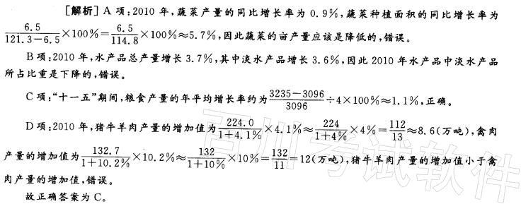 问题 2010年,江苏省全年粮食总产量达3235. 1万吨,比上年增加5万吨;其中夏粮1105. 3万吨,增长0. 2%;秋粮2129. 8万吨,增长0.1%。全年粮食面积为528. 2万公顷,比上年增加1. 0万公顷;棉花面积为23. 6万公顷,减少1. 7万公顷;油料面积57. 4万公顷,减少1. 9万公顷;蔬菜面积121. 3万公顷,增加6. 5万公顷。 2010年,江苏省全年肉类总产量366. 6万吨,比上年增长6. 5%,其中猪牛羊肉产量224. 0万吨,增长4.1%;禽肉产量132. 7万砘,增长10. 2%。禽蛋总产量190.6万吨,增长2.9%。全年水产品总产量459. 5万吨,增长3. 7%,其中淡水产品324. 0万吨,海水产品135. 5万吨,分别增长3. 6%和3. 9%。 下列说法中,正确的是( )。 A.与2009年相比,江苏省2010年蔬菜和棉花的亩产量都大于上一年 B.与2009年相比,江苏省2010年水产品中淡水产品所占的比重在上升 C. “十一五”期间,江苏省粮食产量的年平均增长率约为1.1% D. 2010年,江苏省猪牛羊肉产量的增加值比禽肉产量的增加值大