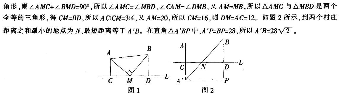问题 公路L一侧有A\B两个村庄,与公路的距离之比为3:4,二者相距千米,公路上 原有一个流动物资供应站M距离两个村庄都为20千米。为节省运输费用,现要求物资供应站 到两村庄的距离之和最小,问最短距离是多少千米?