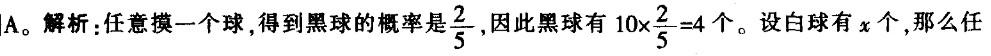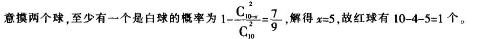 问题 一个袋子里面有10个球,包括红球、白球和黑球。已知从袋中任意摸一个球,得到黑球 的概率是2/5,从袋中任意摸两个球,至少有一个是白球的概率是7/9,问袋子里有多少个红球? a.l b.2 c.3 d.4