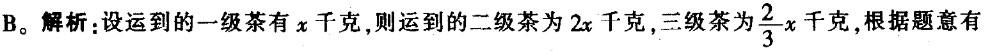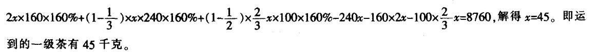 问题 某茶叶店运到一批一级茶、二级茶和三级茶,其中二级茶的数量是一级茶的2倍,三级茶的数量是二级茶的1/3,一级茶的买进价是每千克240元,二级茶买进价是每千克160元,三级茶买进价是每千克100元。现在照买进价加价60%出售,当二级茶全部售完,一级茶剩下1/3, 三级茶剩下1/2时,已经盈利8760元,那么,运到的一级茶有多少千克? a.40 B.45 c.50 d.55