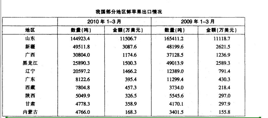 2010年1-3月,我国鲜苹果出口总量为31.2万吨,与上年同期相比下降11%;总出口额为 2.1亿美元,增加4%;平均单价为679美元/吨,上升17%。...