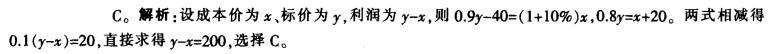 问题 某品牌羽绒服,在促销活动中,九折降价并让利40元销售,仍可获利10%;八折降价销售可获利20元。问不举行促销活动,该羽绒服每件的利润是多少元? A.180 B.190 C.200 D.220