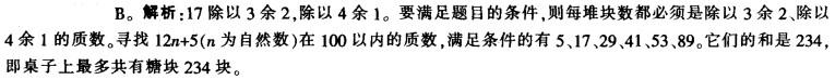 问题 桌上放有多于4堆的糖块,每堆数量均不相同,而且都是不大于100的质数,其中任意三堆都可以平均分给三个小朋友,其中任意四堆都可以平均分给四个小朋友,已知其中一堆糖块是17块,则桌上最多共有糖块多少? A.222 B.234 C.255 D.267