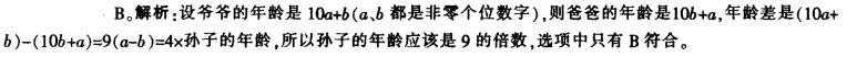 爷爷的年龄是一个二位数,将此二位数的数字交换得到爸爸的年龄,他们的年龄差是孙子年龄的4倍,那么孙子的年龄是:A.7 B.9 C.10 D.12