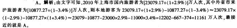 问题 根据以下资料, 2011年全年上海市接待国际旅游入境人数817.57万人次,比上年下降3.9%。其中,入境外国人648.31万人次,下降2.6%;港、澳、台同胞169.26万人次,下降8.7%。在国际旅游入境人数中,过夜旅游人数668.61万人次,比上年下降8.9%。全年接待国内旅游者23079.17万人次,比上年增长2.9%。其中,外省市来沪旅游者10877.27万人次,下降3.4%。 2010年,在上海市国内旅游者中,本地游客达到: A.11168.63 万人次 B.11658.41 万人次 C. 12201.90 万人次 D.12896.35 万人次