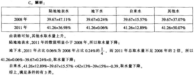 问题 根据以下资料, 2011年,某市工业企业(规模以上,下同)用水总量193.27亿立方米,比上年减少1.66亿立方米。其中,取水总量41.26亿立方米,增加0.57亿立方米;河湖海冷却水86.25亿立方米,增加 1.09亿立方米。 从取水结构来看,与2008年相比,2011年取水量下降的有几类? A.1 B.2 C.3 D.4