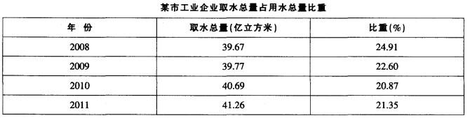 根据以下资料,2011年,某市工业企业(规模以上,下同)用水总量193.27亿立方米,比上年减少1.66亿立方米。其中,取水总量41.26亿立方米,增...