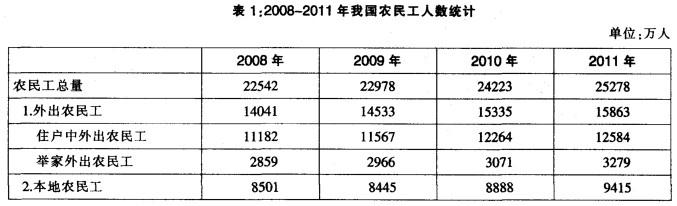 根据以下资料, 2011年全国农民工总量达到25278万人,同比增长4.4%。东部地区农民工10790万人,比上年增加323万人,增长3.1%;中部地...