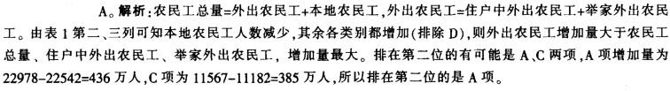 问题 根据以下资料, 2011年全国农民工总量达到25278万人,同比增长4.4%。东部地区农民工10790万人,比上年增加323万人,增长3.1%;中部地区农民工7942万人,增长4.2%;西部地区农民工6546 万人,比上年增加409万人。 下列选项中,2009年人数同比增加量排在第二位的是: A.农民工总量 B.外出农民工 C.住户中外出农民工 D.本地农民工