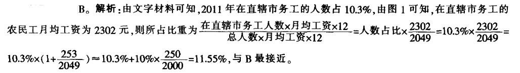 问题 2011年全国农民工总量达到25278万人,增长4.4%。从就业地点看,在直辖市务工的占10.3%,在省会城市务工的占20.5%,在地级市务工的占33.9%,在地级以上大中城市务工的农民工比上年提高1.7个百分点。外出农民工月均工资2049元,增长21.2%。 2011年在直辖市务工的农民工工资总额占全国农民工工资总额的: A.10.3% B.11.6% C.16.3% D.无法计算