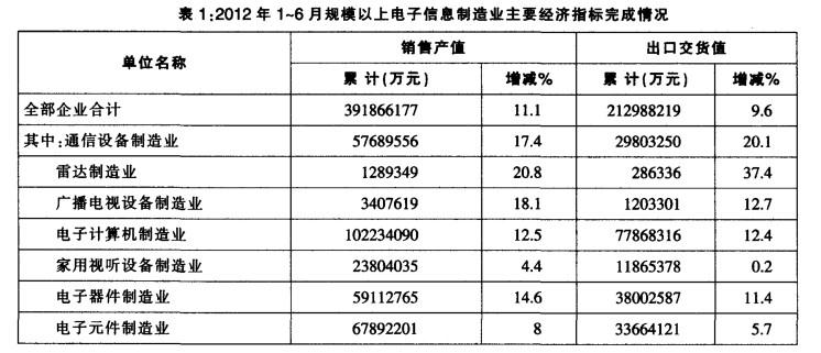 下列说法不正确的是:A.2012年1~6月家用视听设备制造业完成销售产值同比增速低于全行业6.7个百分点B.2011年1~6月电子专用设备...
