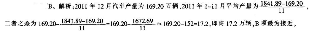 问题 根据中国汽车工业协会统计,我国2011年累计生产汽车1841.89万辆,同比增长0.8%,销售汽车1850.51万辆,同比增长2.5%,产销同比增长率较2010年分别下降了31.6和29.9个百分点。 2011年,乘用车产销分别完成1448.53万辆和1447.24万辆,同比分别增长4.2%和5.2%,同比增长率较2010年分别下降29.6和28.0个百分点;商用车产销分别完成393.36万辆和403.27万辆,同比分别下降10.0%和6.3%,同比增长率较2010年分别下降38.1和36.2 个百分点。 2011年12月,全国汽车生产169.20万辆,同比下降9.3%;汽车销量168.92万辆,同比增长1.4%。其中,乘用车生产136.42万辆,同比下降5.6%,销售136.89万辆,同比增长4.6%;商用车产销分别为32.78万辆和32.07万辆,同比分别下降21.9%和10.4%。 2011年12月汽车产量比2011年1~11月的平均产量: A.高15.71万辆 B.高17.14万辆 C.低15.71万辆 D.低17.14万辆